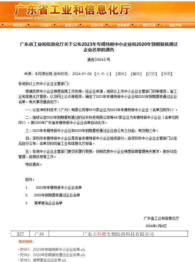 2024年1月6日,廣東省工業(yè)和信息化廳公示2023年專精特新中小企業(yè)名單,經(jīng)過市區(qū)推薦,合規(guī)審查,專家評審等,天科雅榜上有名,喜獲廣東省“專精特新”中小企業(yè)認定。