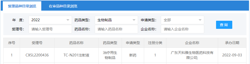 天科雅生物“TC-N201注射液”臨床試驗(yàn)申請(qǐng)于近日提交,9月3日據(jù)CDE官網(wǎng)顯示,“TC-N201注射液”臨床試驗(yàn)申請(qǐng)獲得受理。